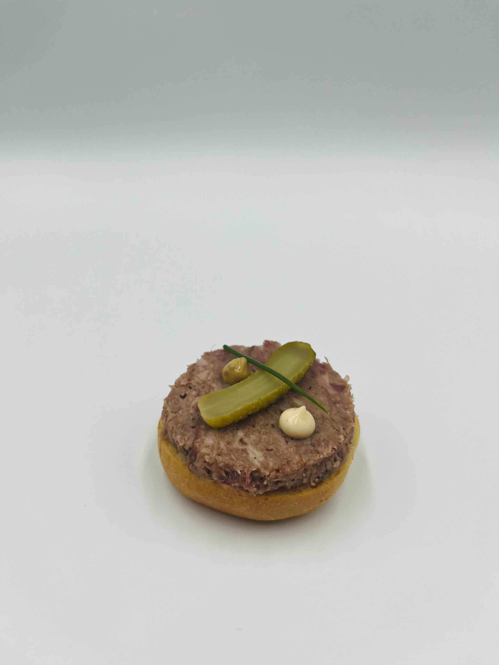 Platter of 8 bites, pork cheek rillettes with sage, pickles and mustard.