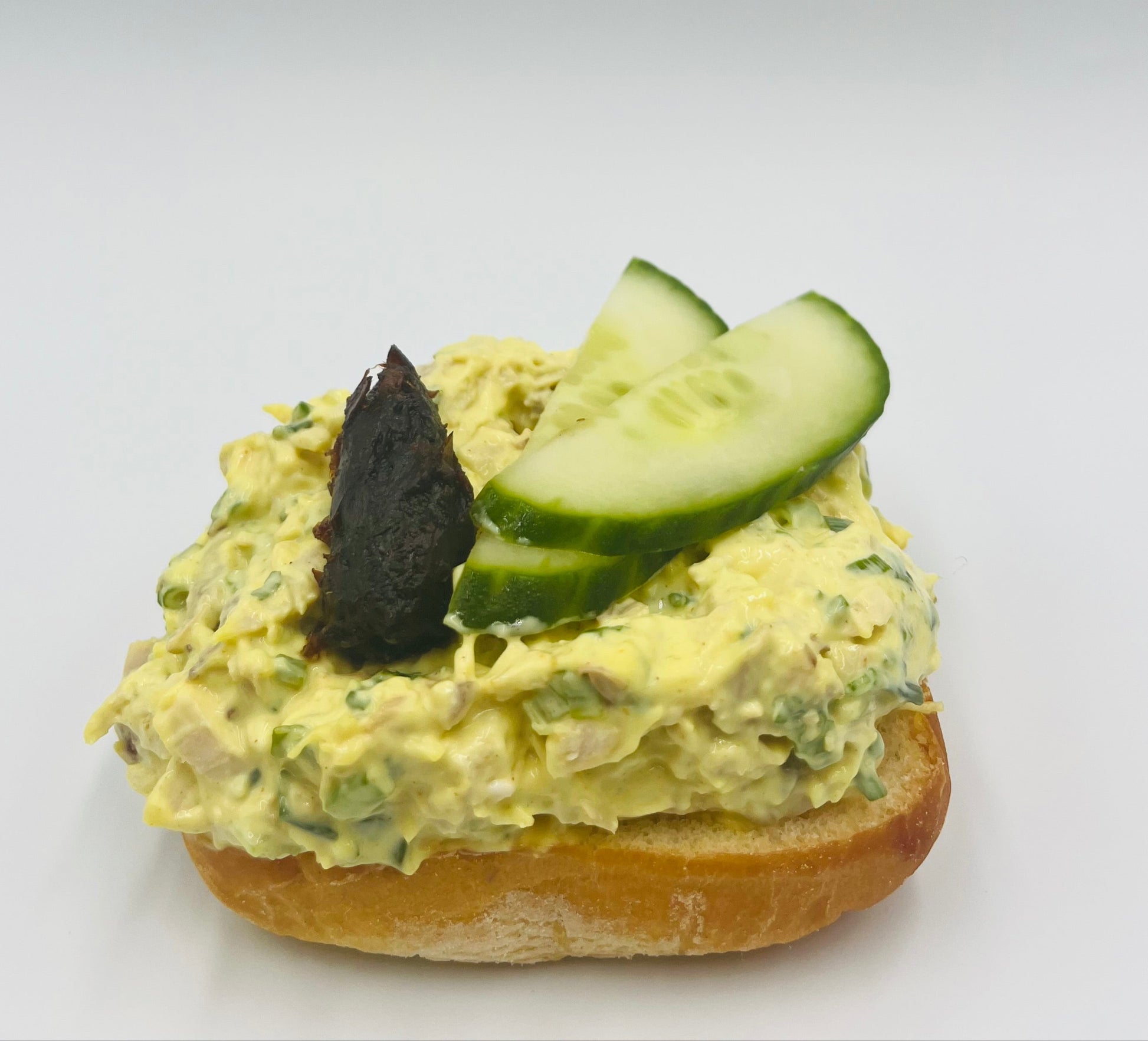 Platter of 8 free-range chicken Antwerp-style chicken sandwiches, curry mayonnaise, celery, green onions, cucumber and date chutney.