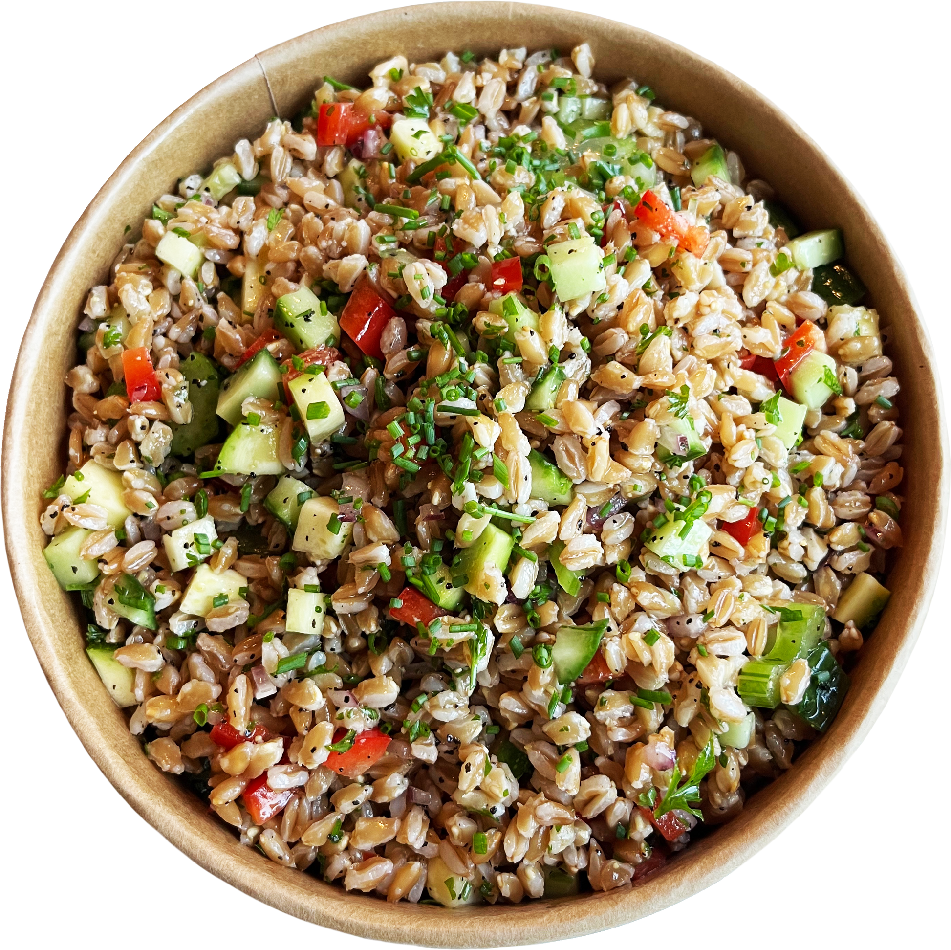 Wheat semolina (farro), peppers, cucumbers, red onions, parsley and lemon dressing.