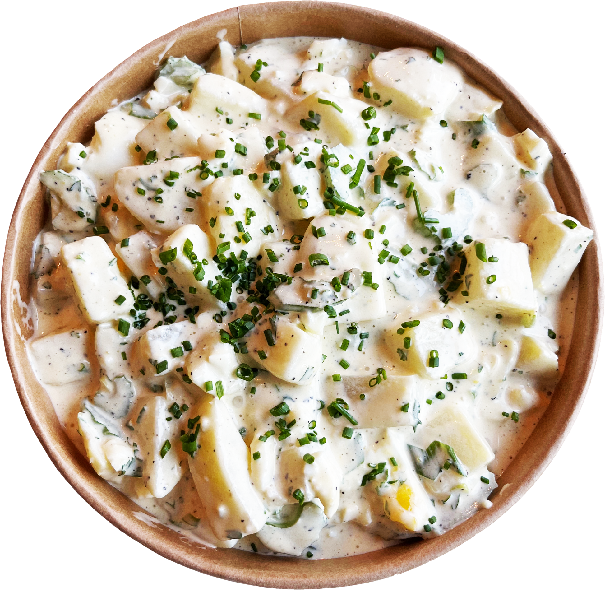 Potato salad in a creamy sauce with soft-boiled eggs, green onions, pickles, celery, and fresh parsley. (Serves 6-8)